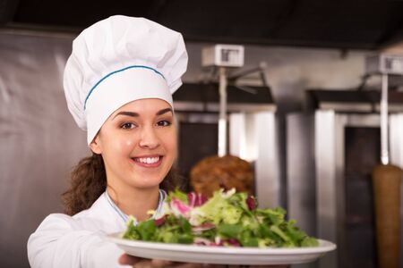 Portrait of friendly girl with salad plate and traditional kebab at fastfood place