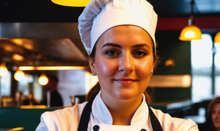 Sensual female chef in a restaurant kitchen, exuding passion and skill with a slight smile. Her culinary creations are a feast for the senses. AI Generative AI