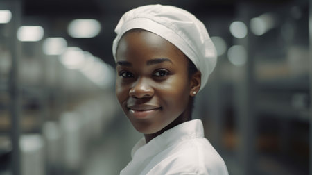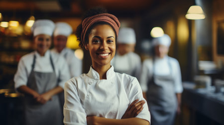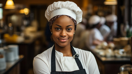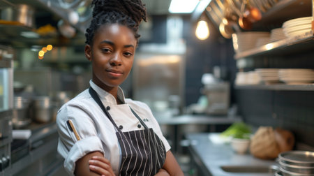A young African-American female chef confidently smiles in the kitchen, demonstrating culinary skills and passion for cooking delicious dishes