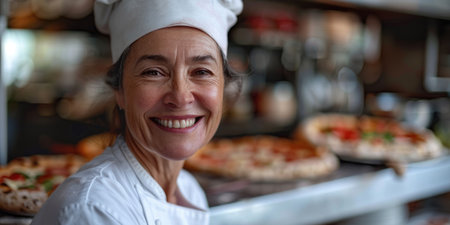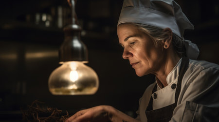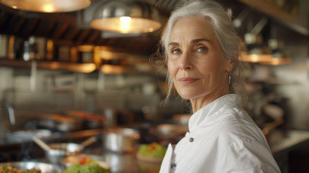 Chef Female Caucasian 50s Preparing food in Kitchen. Generative AI AIG22.