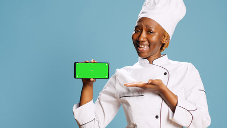 African american chef holding phone with greenscreen, advertising isolated copyspace display in studio. Young woman cook using smartphone with blank chroma key mockup template.