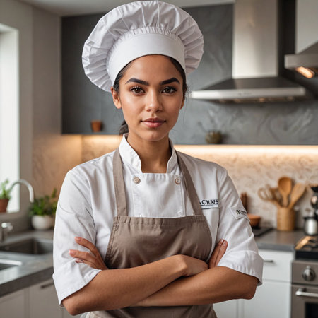 A woman standing in a kitchen wearing a chefs uniform. Generative AI image.