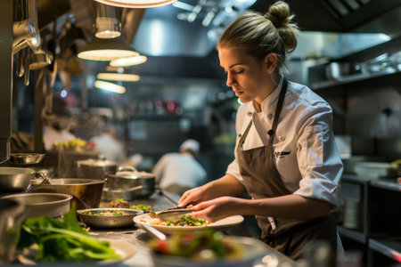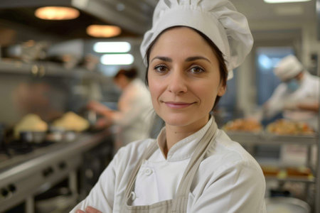A focused chef stands in a busy kitchen as the evening service begins. She wears a chef coat and hat, surrounded by the activity of her team and the aroma of delicious food.