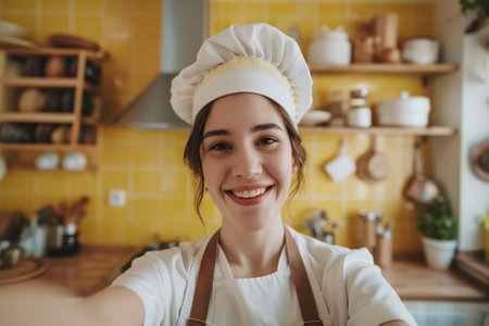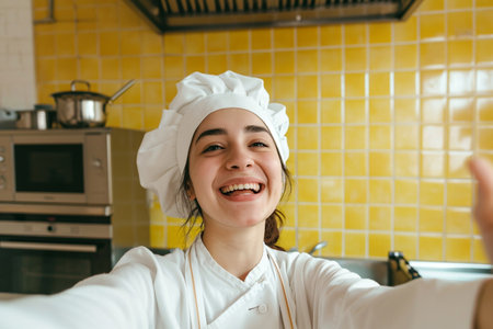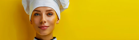 Portrait of a Young Female Chef Wearing Uniform and Hat Against a Yellow Background with Copyspace AI Generative