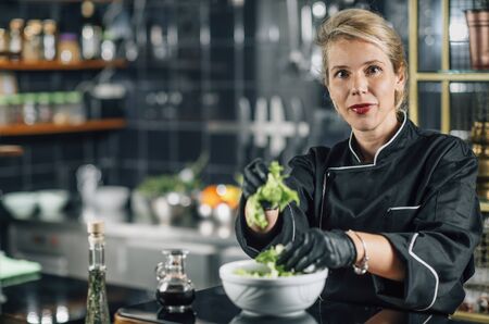 Female chef in a professional kitchen making an elaborated dish.Generative AI.