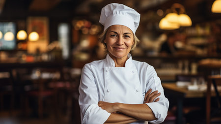 Portrait of a smiling female chef with hands crossed in the kitchen.