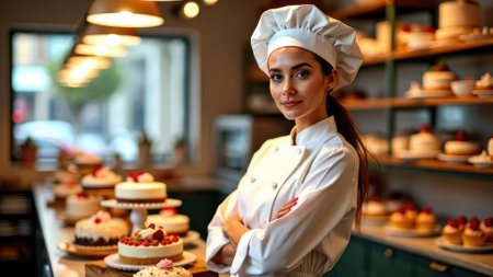 A young pastry chef poses proudly in her bakery, surrounded by an array of beautifully decorated cakes and pastries, showcasing her culinary creations.