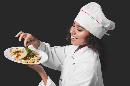 Generative AI illustration of Beautiful Black young woman dressed as a cook showing food in her hand working in a large restaurant kitchen. Haute cuisine food concept