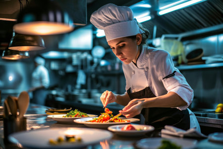 A young chef focuses intently as she artfully arranges edible flowers on a beautifully crafted dessert. The modern kitchen buzzes with activity, showcasing her culinary skills and creativity.