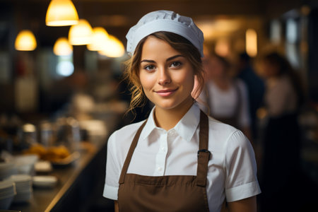 Portrait of a beautiful young woman in apron posing in a restaurant kitchen.