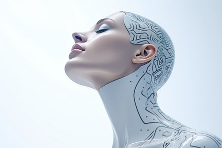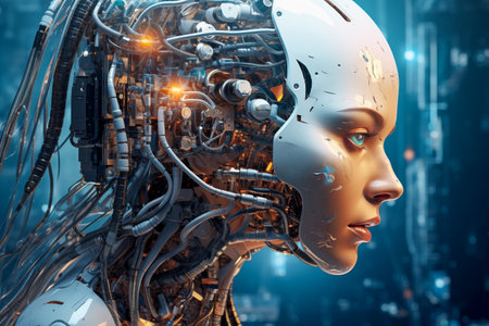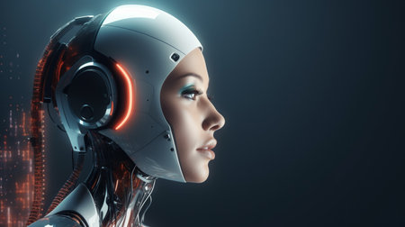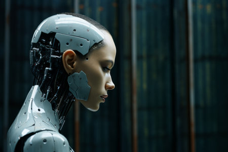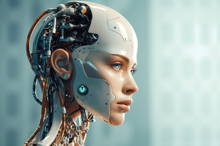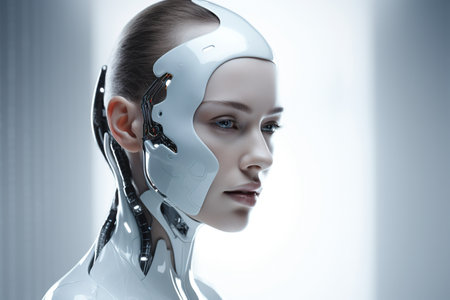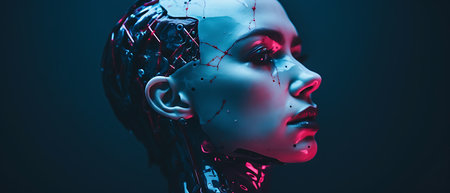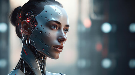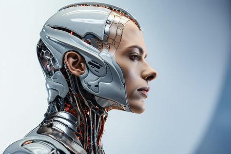 A close-up profile of a female android with a human face and robotic components, showcasing the fusion of technology and humanity.