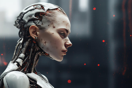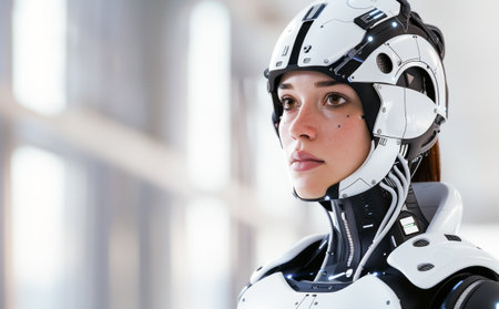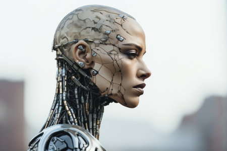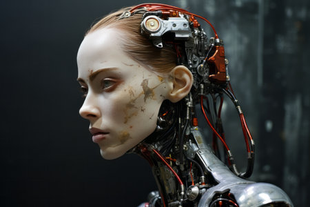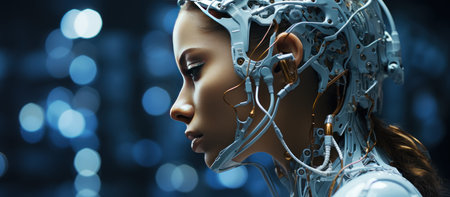 Portrait of a female cyborg looking into the distance. Close-up.