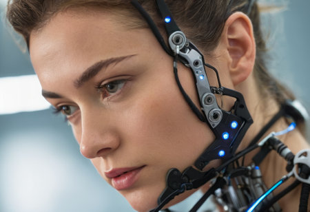A cyborg woman with an interface headset, focused. She appears immersed in a high-tech task, determination evident.