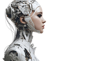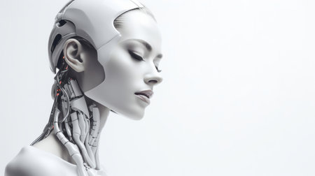Futuristic female robot, android portrait. Human like features. On white backdrop.