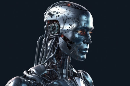 3d rendering humanoid robot or cyborg with artificial intelligence on dark background