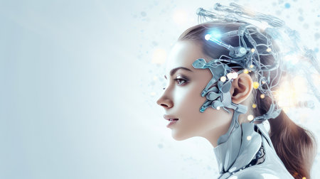 Woman with robotic parts in profile view. Concept of human machine synergy, cybernetic organism, future of Artificial intelligence. Copy space. Light background