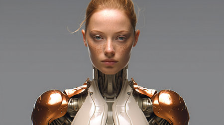 Redhead female robot looking at the camera on grey background.