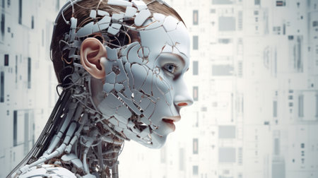 3d rendering of a female cyborg with a broken head.
