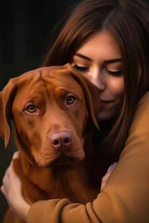 A woman petting a cute red dog, sleeping on her lap. Close-up. Love Your Pet day. AI Generative