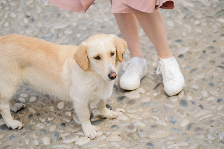 Portrait of lovely street dog stands nearby his owner, over street background. Woman lags in sport shoes and skirt