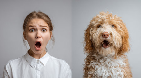 A person and a dog display surprise in a split scene with neutral backgrounds. Both show emotional reactions that connect them through the moment.
