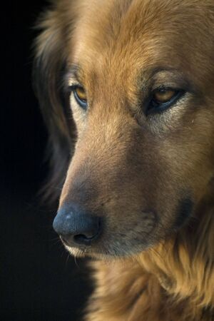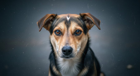 Portrait of a mixed breed dog on a dark background. Selective focus.