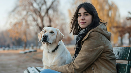 Woman sitting on a bench with her Labrador Retriever dog, both looking at the camera. Copy space on the left.