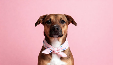 A cute mixed-breed dog with brown fur and a white chest looks directly at the camera in a studio setting. The canine wears a stylish pink and white scarf, isolated on a plain background.