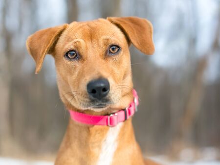 Adorable red dog in a city park. Portrait of a dog. Place for text.