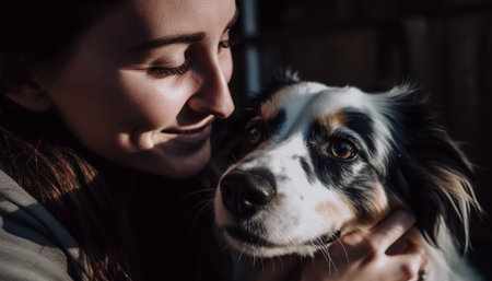 A young Caucasian woman cuddles her dog, sharing a warm moment in a serene, natural setting.