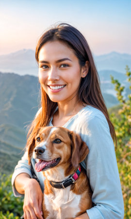 Smiling Woman With Her Dog Enjoying a Mountainous Lakeside View at Sunset.