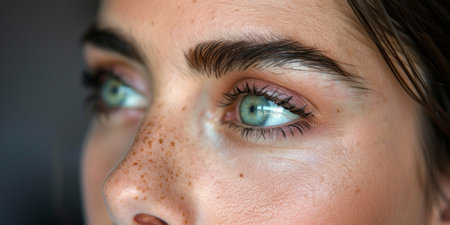 Close-up of a womans striking green eye with freckled skin and perfectly groomed eyebrows
