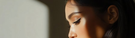 A young woman gazes thoughtfully with a serene expression highlighting her graceful features and professional makeup. Soft lighting creates a calm ambiance emphasizing her profile.