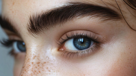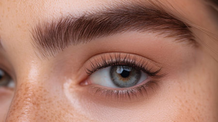 Close-up of a womans eye showcasing vibrant green iris and neatly groomed eyebrows