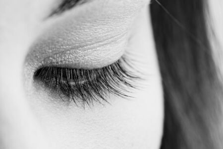 Concept of beauty and fashion. Banner women's eyes with long false eyelashes. Macro snapshot.