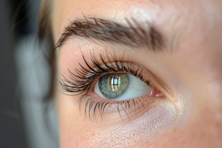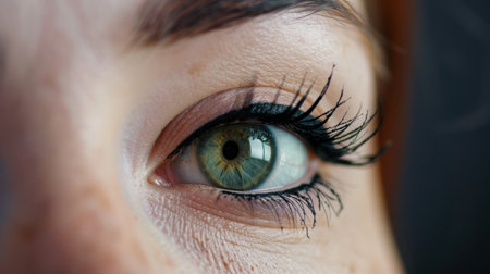 A stunning close-up photo highlighting a captivating human eye, showcasing its intricate details, vibrant color, and beautifully defined lashes.