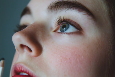 Close-up portrait of a young caucasian woman before eyelash lamination procedure.