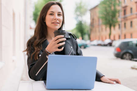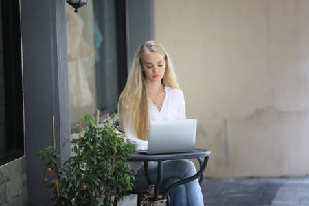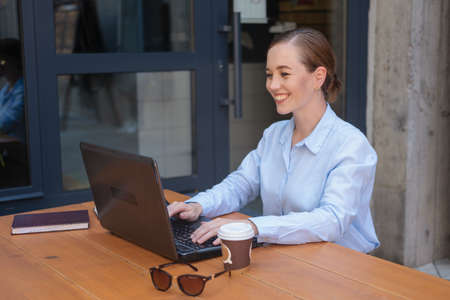 A young stylishly dressed woman is sitting in a summer cafe. The laptop is on the table. Freelance work