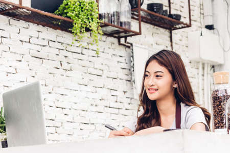 Portrait of woman small business owner working behind the counter bar in a cafe.Barista using laptop and receive order from customer