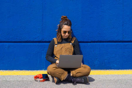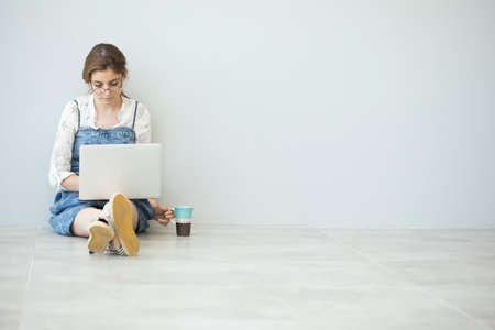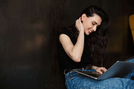 Photo of beautiful young brunette woman in jeans sitting on floor and using laptop isolated over concrete background