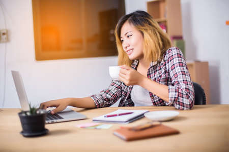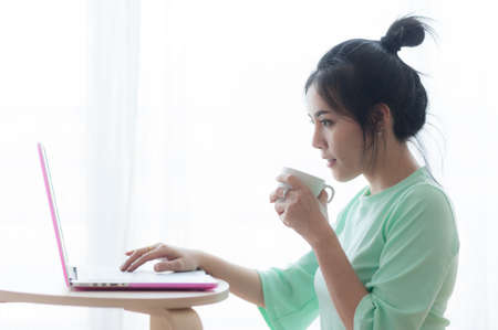 Young attractive Asian woman freelancer holding coffee cup while working with laptop computer. Work at home and online learning concept