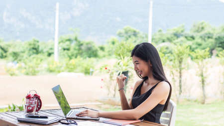 Asian woman using smartphone at home while working with laptop computer. Online business and wireless working from anywhere concept