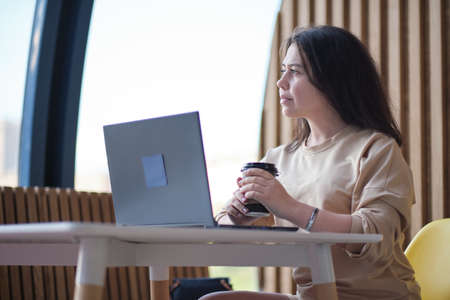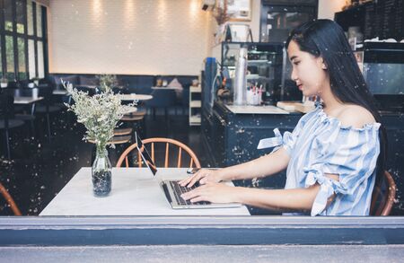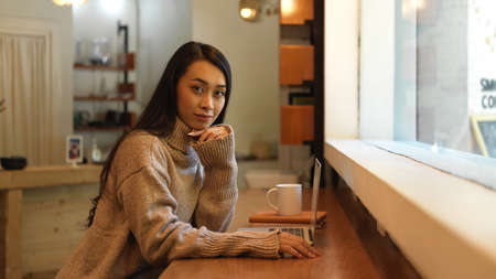 Young woman sitting in a beautiful coffee shop, drinking hot coffee in the morning, take a break after work on laptop computer.