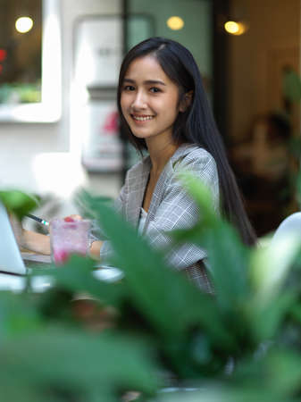 Portrait of happy business young woman, smiling while sitting in caffe and work with laptop