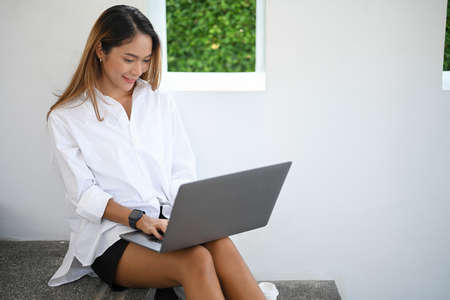 Attractive Asian young female in a casual outfit sitting on the stairs and using her laptop computer