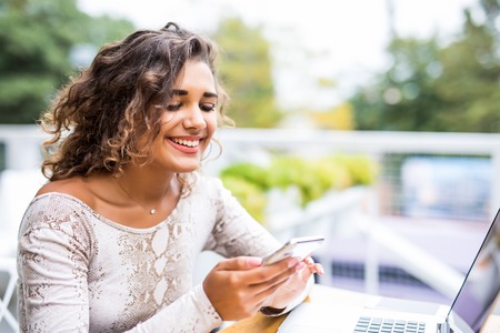 Portrait of happy young latin woman in a coffee shop using mobile phone