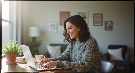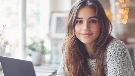Young woman sitting at a desk with a laptop and coffee, exuding confidence in a modern home office setting.