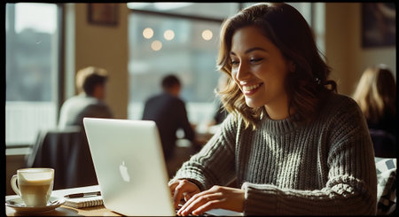 happy woman using laptop while sitting at cafe. Girl browsing internet, chatting, blogging. Brunette studying on laptop and enjoying coffee