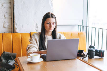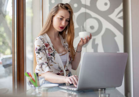 Young attractive woman is sitting in front of an open laptop in a coffee shop. Modern young business woman is working on a new project, looking at the screen of a portable computer.