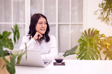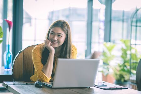 Beautiful Attractive Asian woman working with computer laptop and thinking to get ideas and requirement in Business startup feeling so happiness,Business Startup Concept